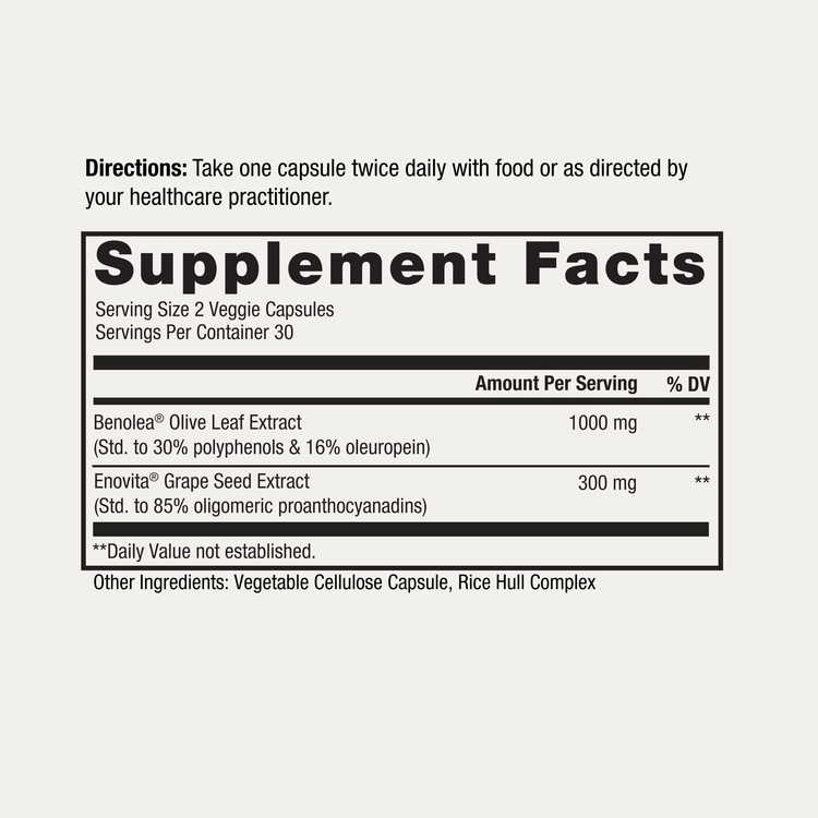 Durable BLOOD PRESSURE is enhanced with a 1,000 mg extra-strength dose of clinically validated Benolea® olive leaf extract. Benolea® provides high levels of the heart-healthy polyphenol oleuropein, which increases nitric oxide production while promoting healthy blood flow and blood pressure.*