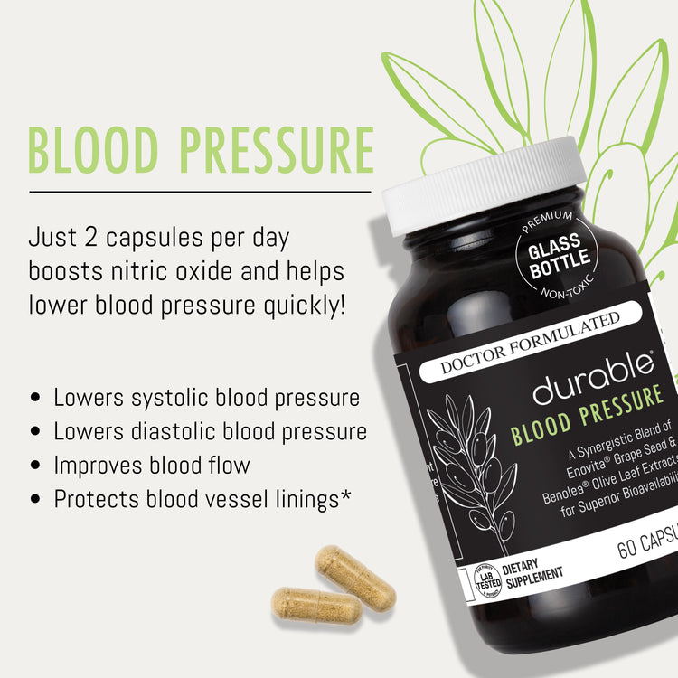 No other supplement combines these two powerful ingredients in one convenient formula. Durable BLOOD PRESSURE delivers comprehensive support for healthy blood pressure and heart health—in just two capsules a day and without unwanted side effects.*