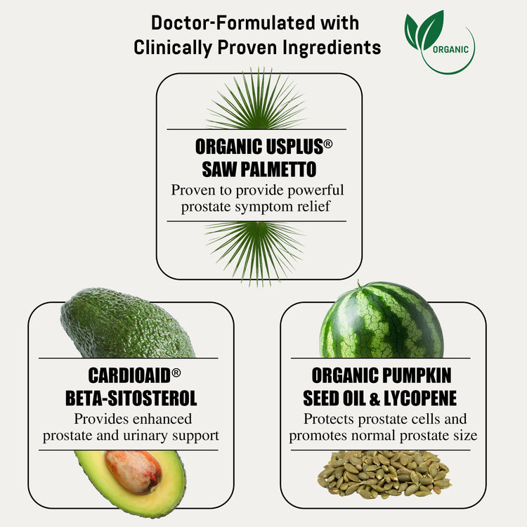 It starts with a clinically proven 320 mg dose of patented, certified organic USPlus® saw palmetto extract, which is standardized to provide 85% fatty acids in the precise ratio shown in over 40 years of clinical research to dramatically improve prostate symptoms with an 88% rate of efficacy. Most supplements are standardized to much lower, unproven fatty acid concentrations and made with saw palmetto grown overseas with heavy pesticide application.*