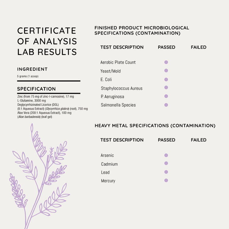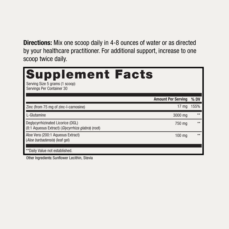 Unlike traditional pills, this pleasant-tasting, naturally sweetened powder dissolves easily in water, delivering immediate relief by directly coating and soothing irritated tissues. Each serving includes 750 mg of highly absorbable DGL (deglycyrrhizinated licorice) extract, 100 mg of aloe vera (in a potent 200:1 concentration), 3,000 mg of glutamine and 75 mg of zinc carnosine.*