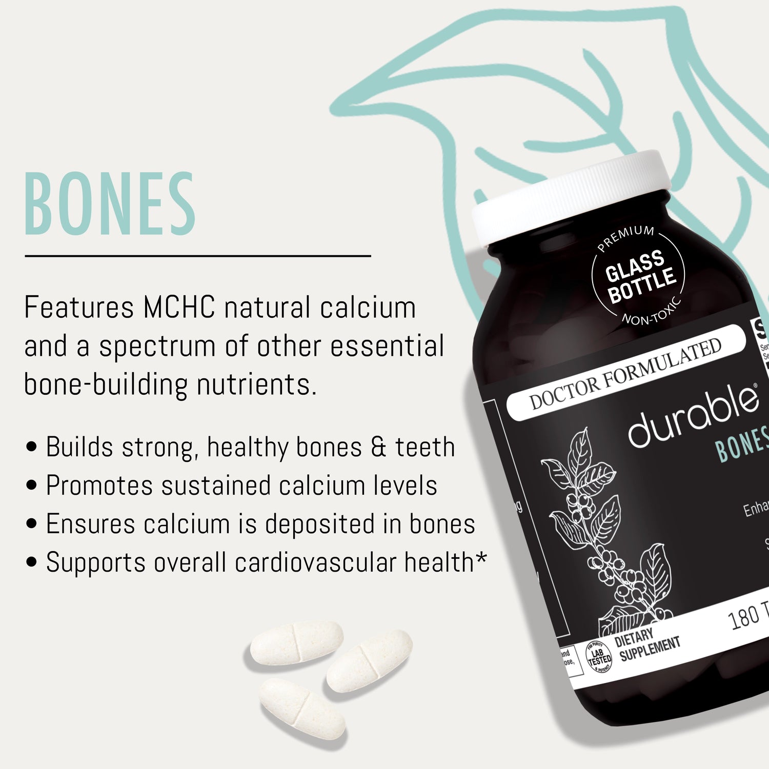 Durable BONES provides an advanced blend of key nutrients for strong, healthy bones and teeth, including calcium and magnesium in the ideal 2:1 ratio for optimal absorption. It does all this with a unique, easy-to-absorb form of calcium known as microcrystalline hydroxyapatite concentrate—MCHC for short—combined with a blend of three forms of magnesium for full spectrum effectiveness as well as the natural form of vitamin D called D3.*