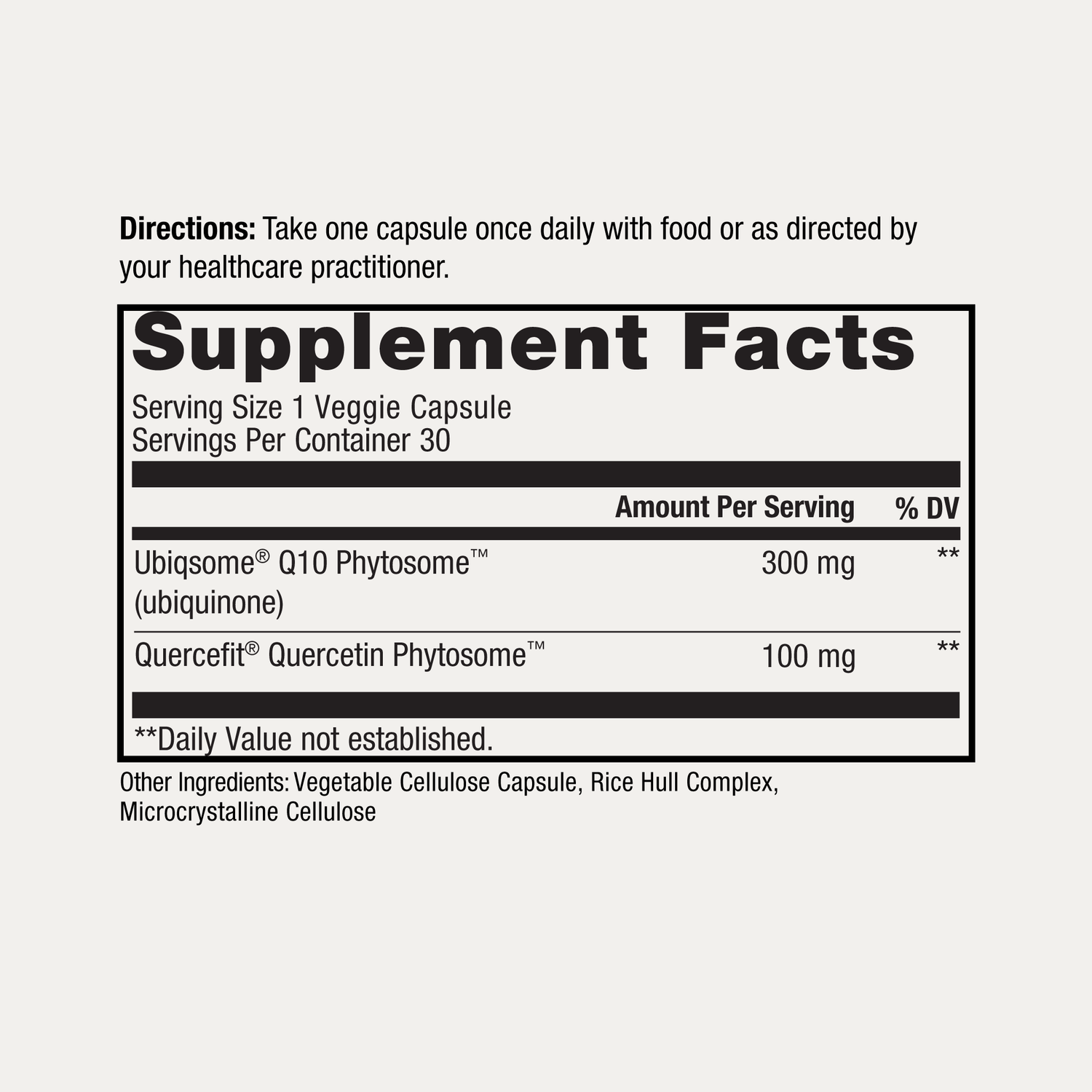 Durable CoQ10 features an extra-strength 300 mg dose of Ubiqsome® CoQ10 Phytosome™. Many inferior CoQ10 supplements provide not only a smaller, less effective dose, but this smaller dose is also difficult for your body to absorb. Plus, Durable CoQ10 is enhanced with Quercefit® Quercetin Phytosome™, which provides antioxidant, cardiovascular and immune health benefits and works synergistically with CoQ10 to enhance its effectiveness in your body.*