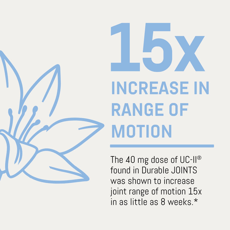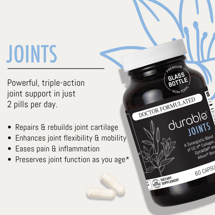 Whether you're dealing with stiffness in your back, knees, wrists or hips—or just want to stay active as you age—Durable JOINTS provides unparalleled joint care in a convenient two-capsule formula, free of side effects.*