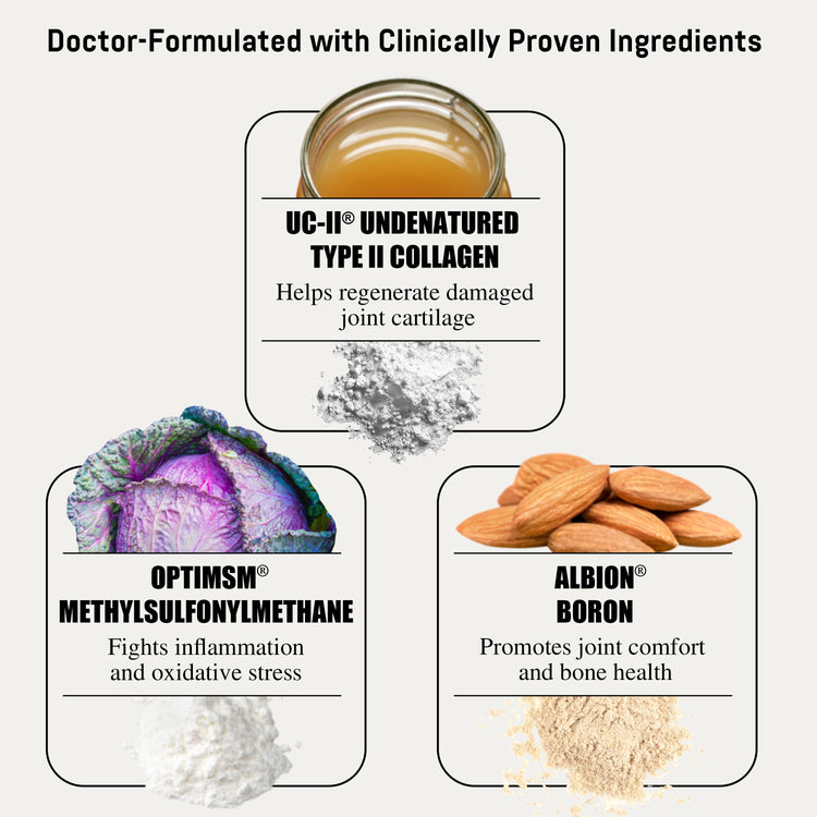 MSM also reduces inflammation—the main driver behind joint pain. Ongoing inflammation can damage cartilage, increase stiffness and limit mobility. Working in perfect synergy with the collagen-boosting effects of UC-II®, MSM protects newly formed and existing collagen from the degrading effects of immune-driven inflammatory compounds like interluken-1 commonly found in aging and painful joints.*