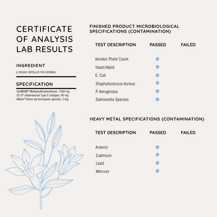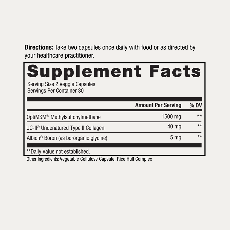 MSM also enhances the collagen-building effects of UC-II by providing an abundant source of sulfur, which is essential for the production of collagen and keratin—two key proteins that contribute to joint structure, skin elasticity and tissue strength. By supporting collagen synthesis, MSM may help preserve cartilage and improve joint flexibility over time.*