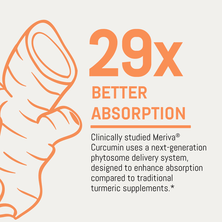Sourced from a leading Italian innovator of absorption technology, Meriva® addresses the absorption issues turmeric is notorious for with cutting-edge natural phytosome technology. Meriva® combines turmeric’s curcuminoids with phosphatidylcholine into a single, easy-to-absorb compound. This phytosome technology is a food-based delivery system, meaning that it mimics the superior absorption characteristics seen when healing compounds are naturally obtained in the diet from food.*