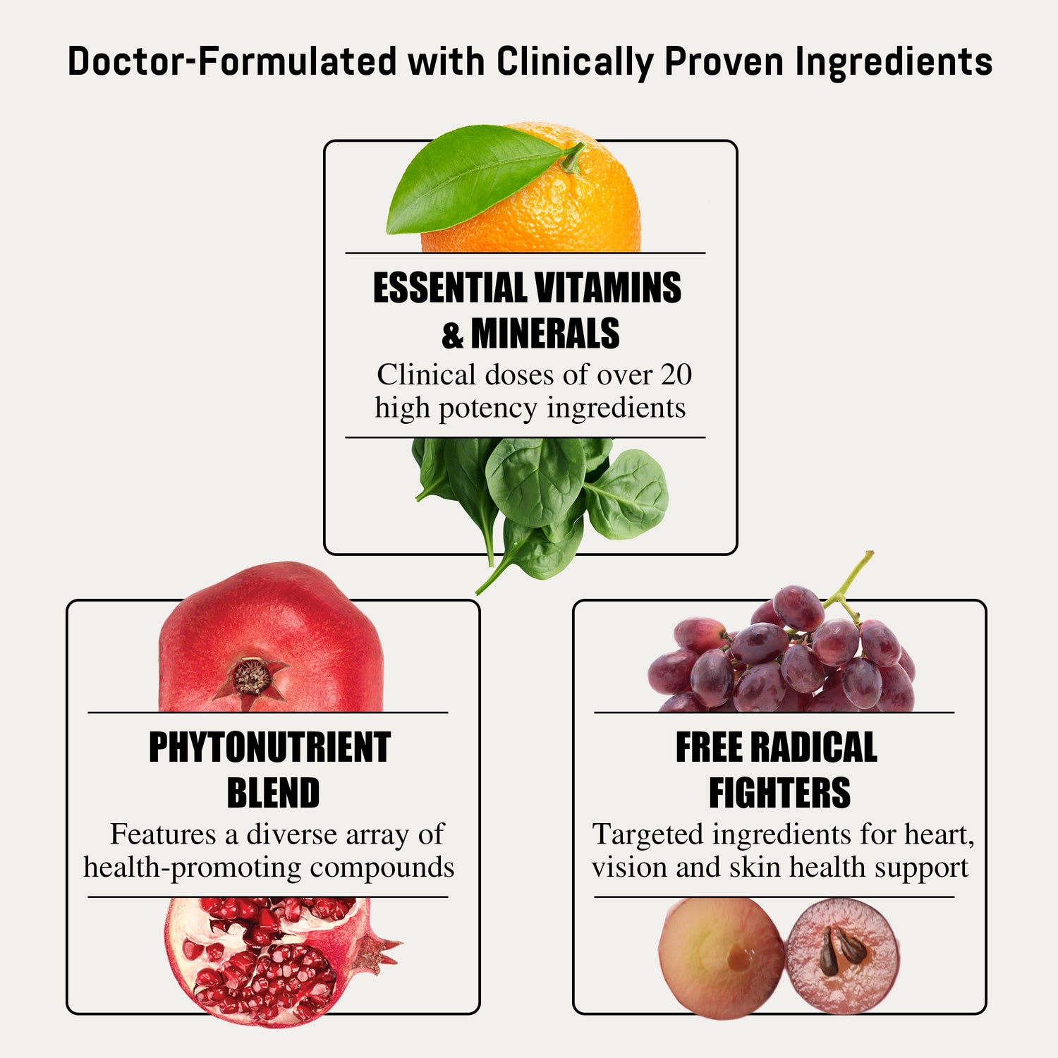 A high-potency blend of 20+ essential vitamins and minerals your body needs to thrive—in forms shown to be most effective in the research and at clinical doses that meet or exceed the RDA.