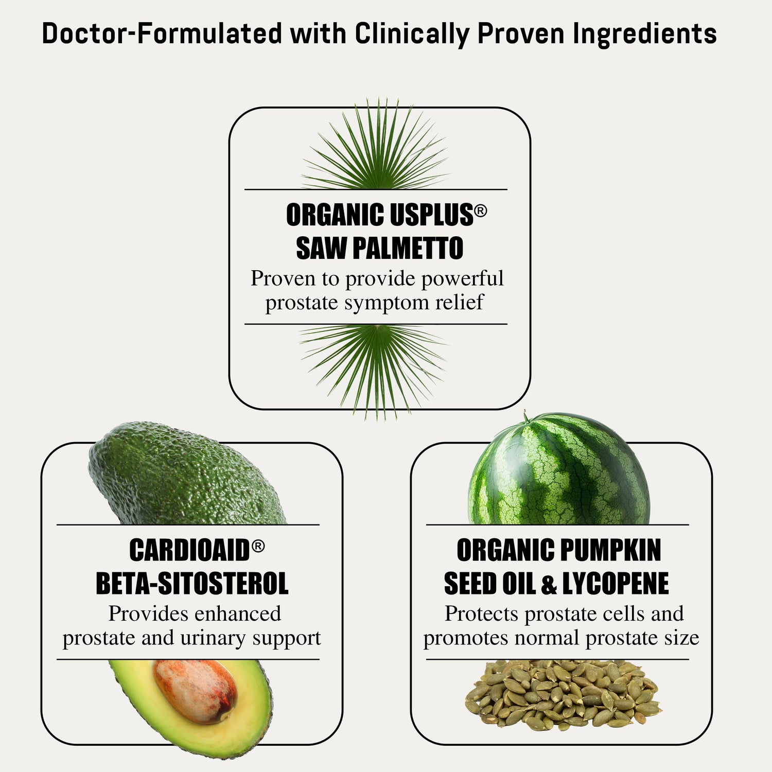 It starts with a clinically proven 320 mg dose of patented, certified organic USPlus® saw palmetto extract, which is standardized to provide 85% fatty acids in the precise ratio shown in over 40 years of clinical research to dramatically improve prostate symptoms with an 88% rate of efficacy. Most supplements are standardized to much lower, unproven fatty acid concentrations and made with saw palmetto grown overseas with heavy pesticide application.*