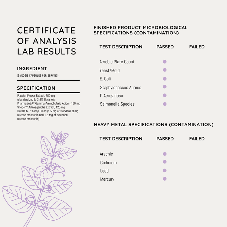 PharmaGABA® promotes relaxation and stress relief, while Shoden® ashwagandha regulates the stress hormone cortisol, which can disrupt your circadian rhythm and interrupt sleep if left unchecked. Lastly, this well-rounded formula includes standardized passion flower extract, which has been proven to induce calmness and improve overall sleep quality.*