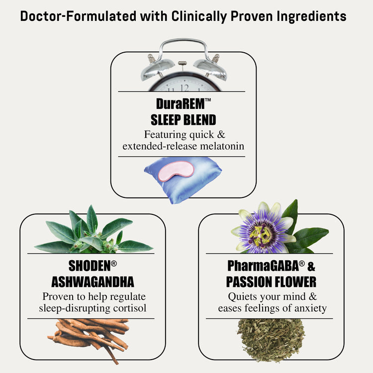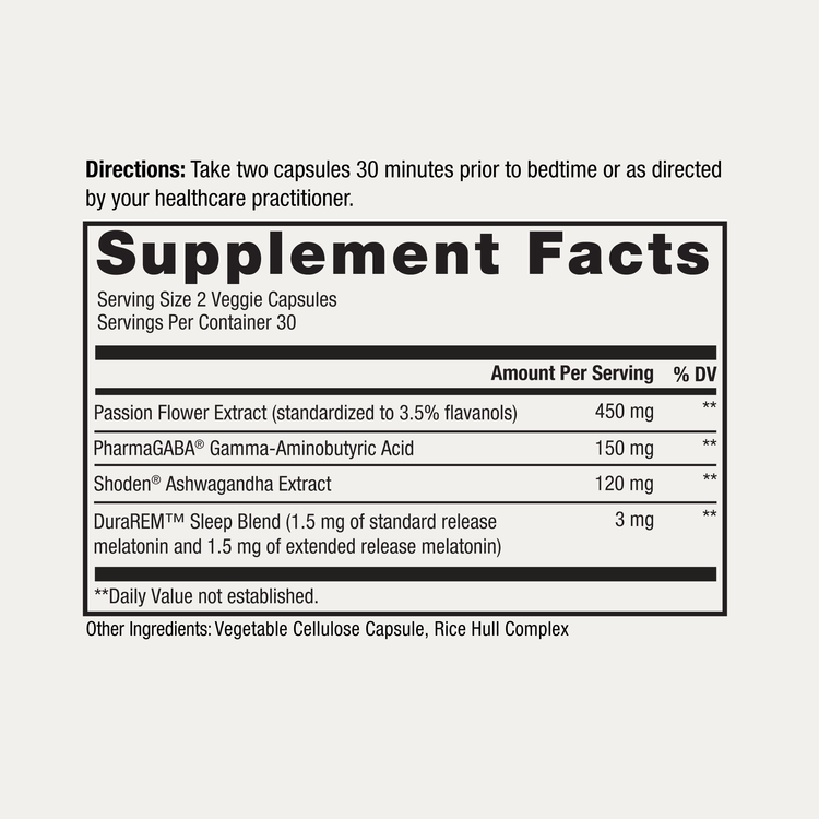 It is a comprehensive supplement that features the proprietary DuraREM™ Sleep Blend containing both quick-release melatonin and extended-release melatonin as well as PharmaGABA®, Shoden® ashwagandha and passion flower extract.*