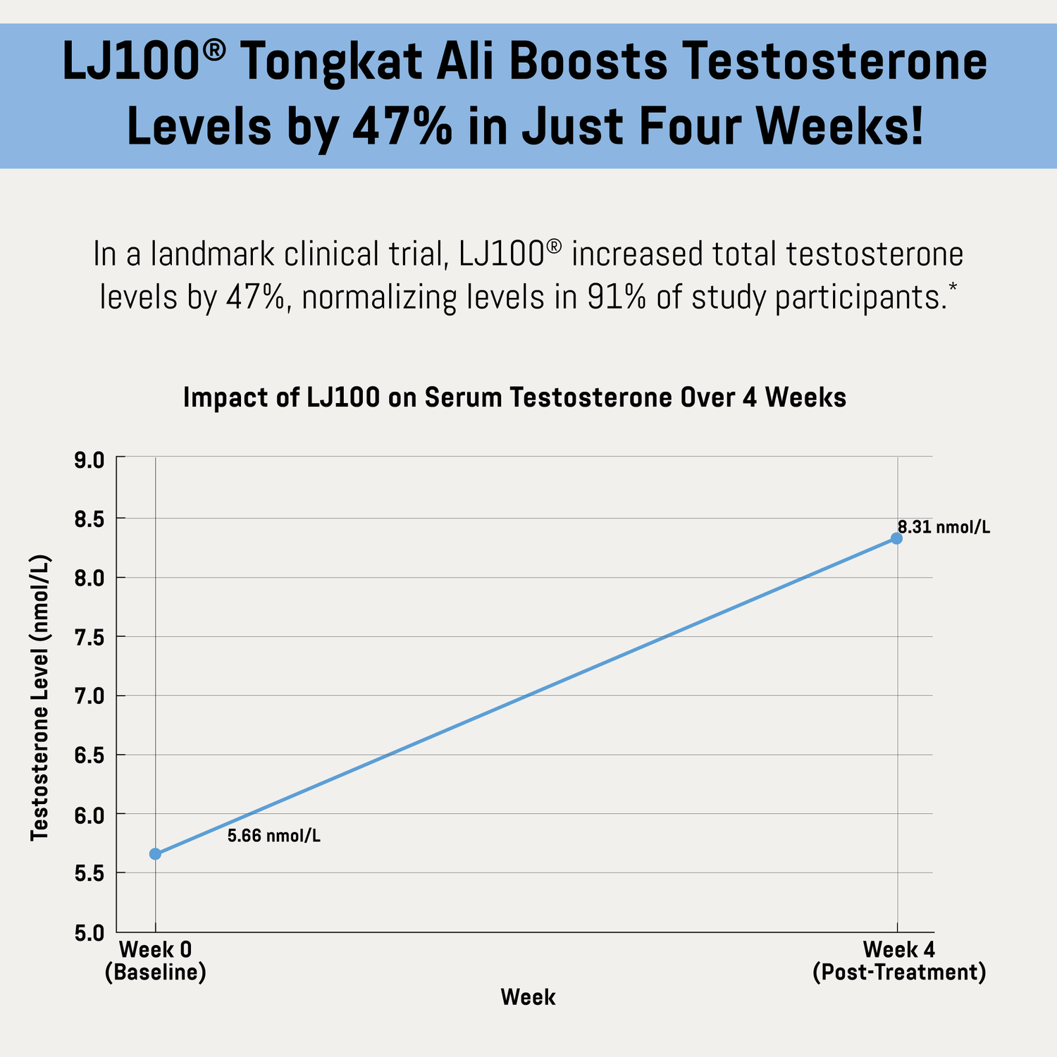 In fact, studies on LJ100® have shown a remarkable 47% increase in total testosterone, increased free testosterone in 73% of men within just three weeks, and an amazing 91% overall rate of efficacy for normalizing men’s hormone levels within just four weeks.*