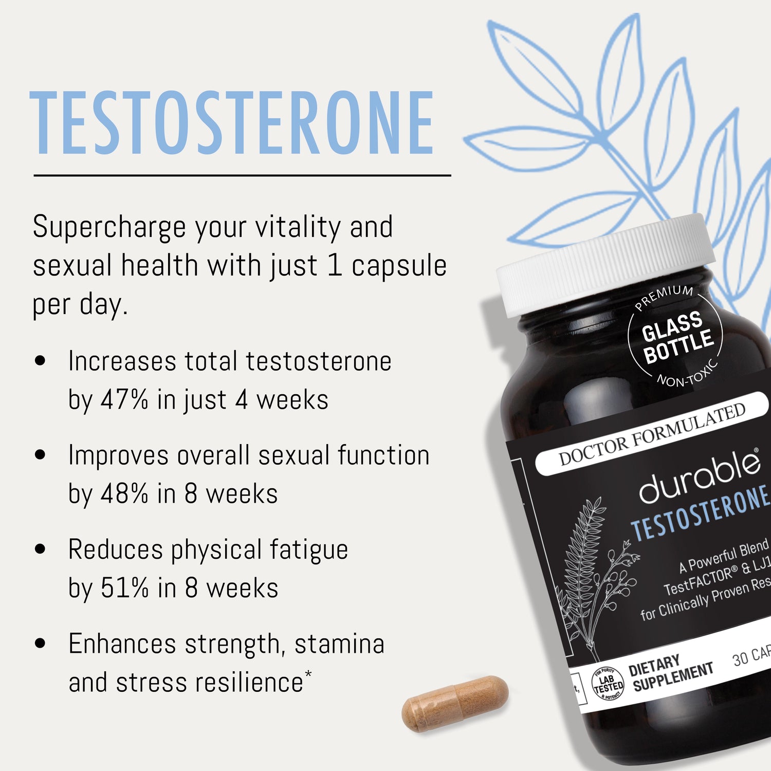 No other supplement combines these two proven ingredients in one convenient formula. Durable TESTOSTERONE delivers comprehensive and rapid support for optimal men’s health—in just one capsule a day and without the side effects.*
