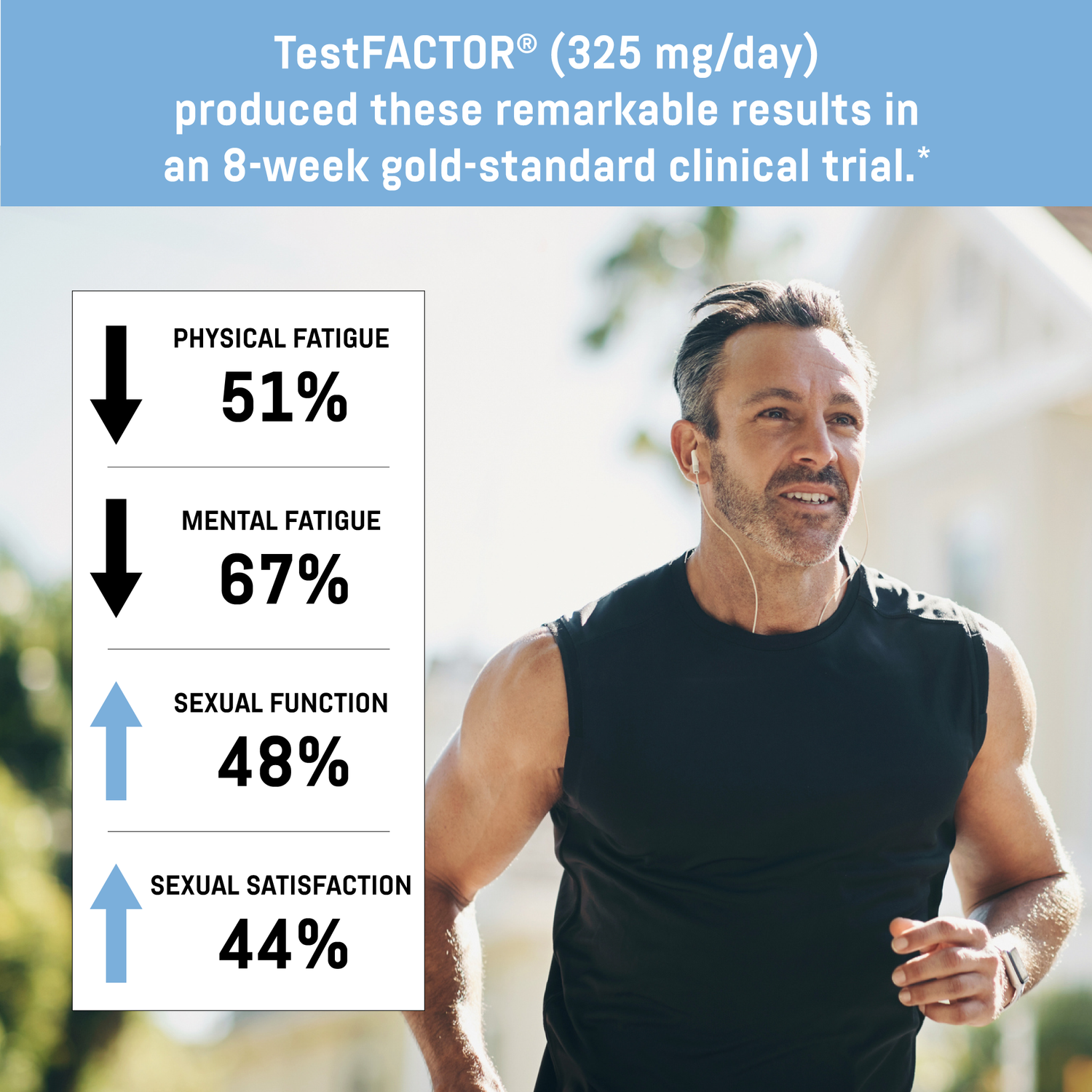 In a gold-standard 8-week clinical trial, TestFACTOR® significantly increased both free and total testosterone, improved sexual function by 48%, boosted sexual satisfaction by 44%, reduced physical fatigue by 51% and mental fatigue by 67%, and increased grip strength by 14.5%—a key predictor of healthy aging.*