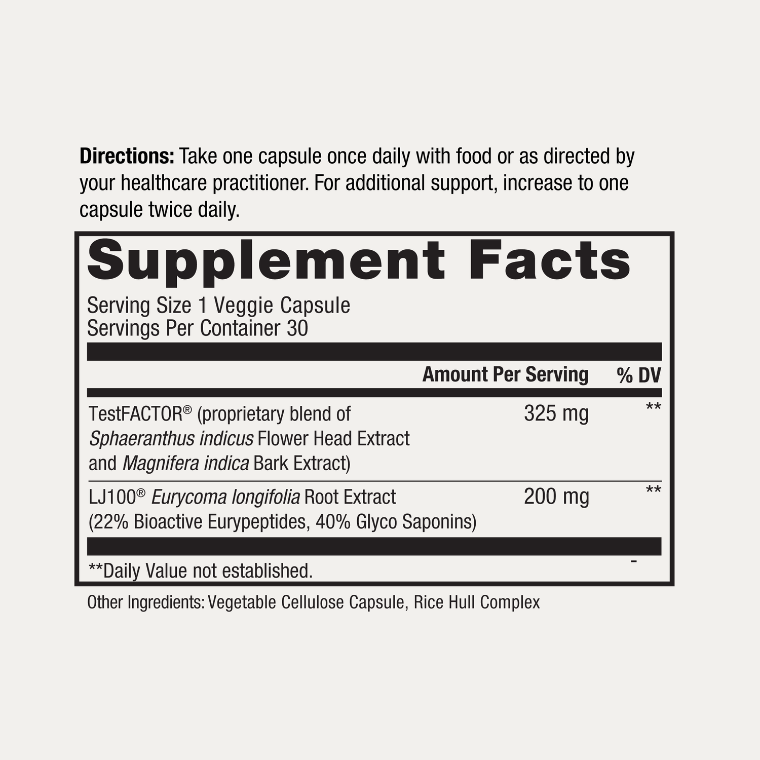 Durable TESTOSTERONE is enhanced with a 325 mg extra-strength dose of TestFACTOR®, a patented blend of East Indian globe thistle and mango bark extracts traditionally used in Ayurvedic medicine for vitality and stamina.*