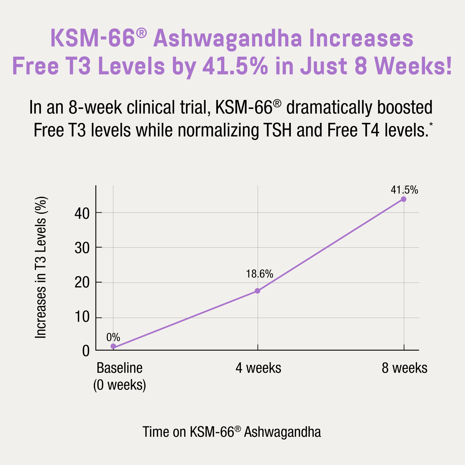 Made from sustainably harvested ashwagandha roots, this standardized extract is the most clinically studied ashwagandha extract in the world, backed by 32 gold-standard clinical trials demonstrating it safety and effectiveness—and the only one proven to boost Free T3 by 41.5%.*