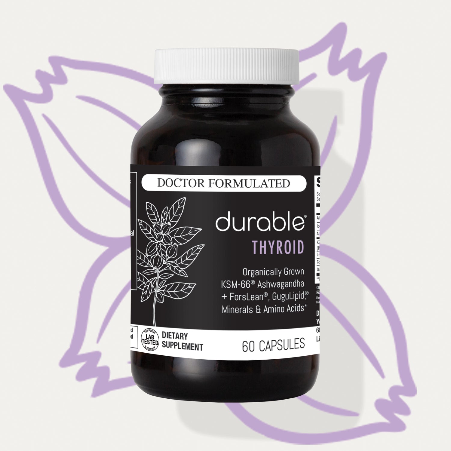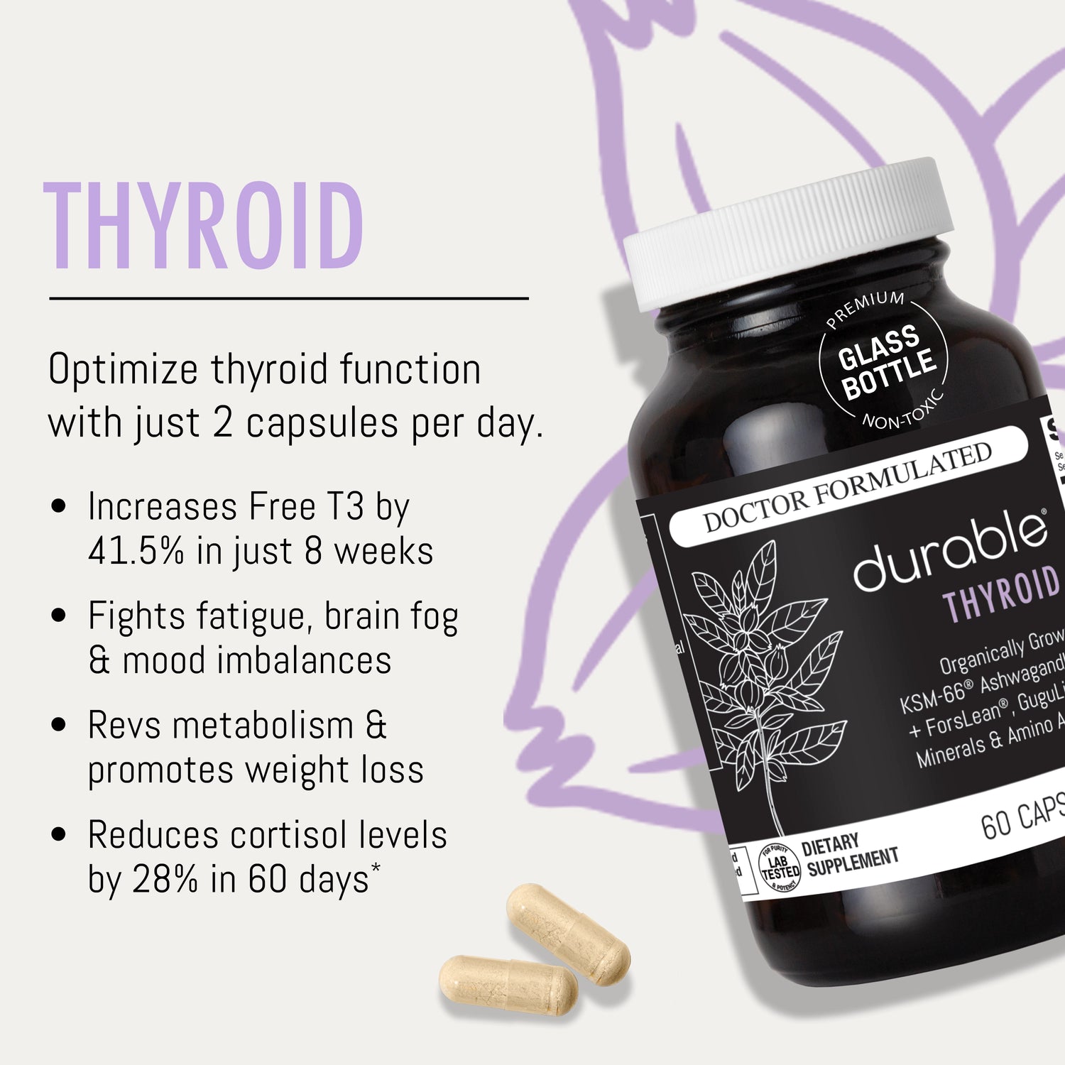 Doctor-formulated, science-backed Durable THYROID targets the most common underlying causes of thyroid dysfunction with powerful, clinically proven ingredients that support healthy thyroid hormone production, proper immune balance, stress resilience and overall metabolic health to help get you feeling like yourself again.*