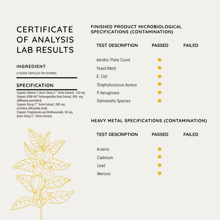 Together, organic KSM-66® ashwagandha and organic Storg-C® amla create a powerful and pure synergistic formula that helps your body adapt to stress while enhancing sleep quality, mood, mental clarity, energy, hormonal balance and immunity—without unwanted side effects.*