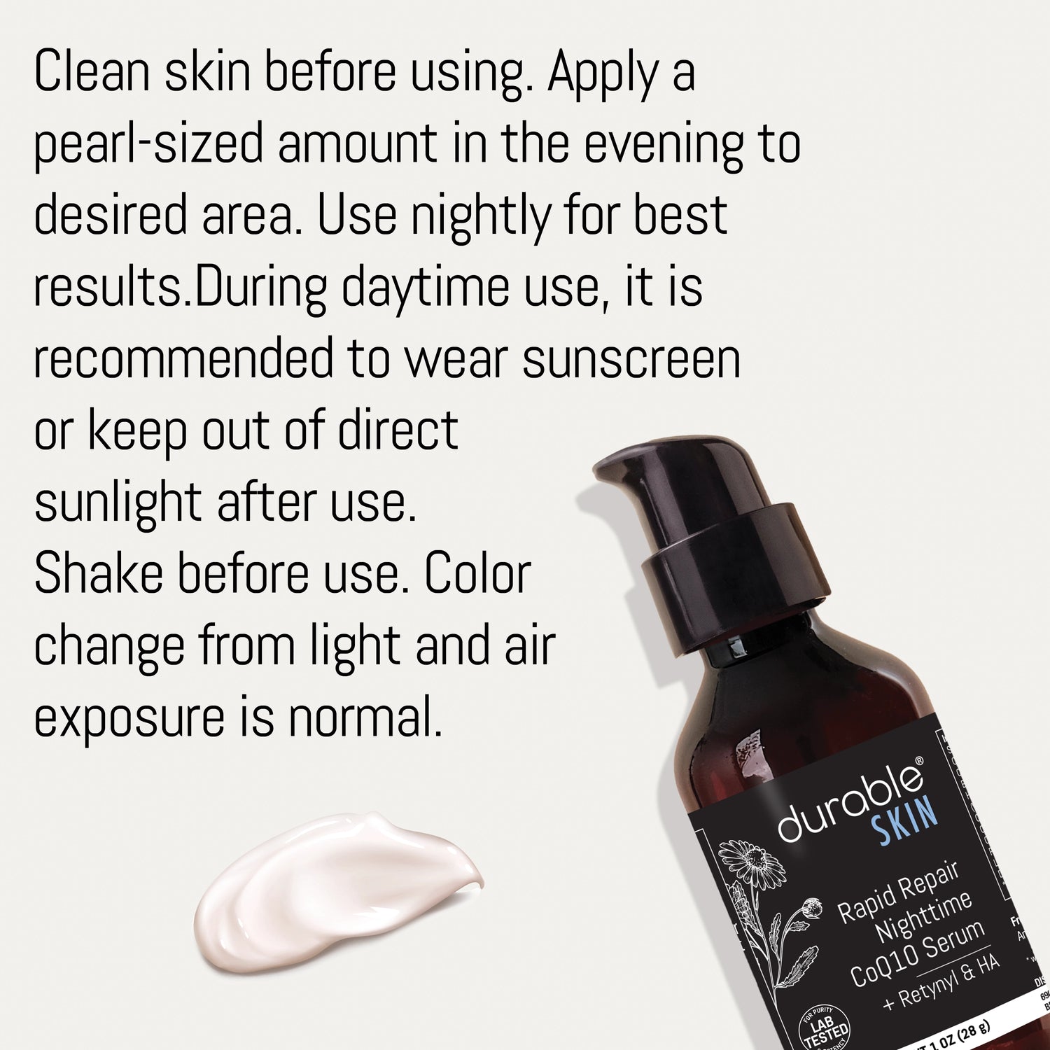 Clean skin before using. Apply a pearl-sized amount in the evening to desired area. Use nightly for best results. During daytime use, it is recommended to wear sunscreen or keep out of direct sunlight after use. Shake before use. Color change from light and air exposure is normal. For enhanced results, we recommend following our Durable SKIN 3-Step Ritual.