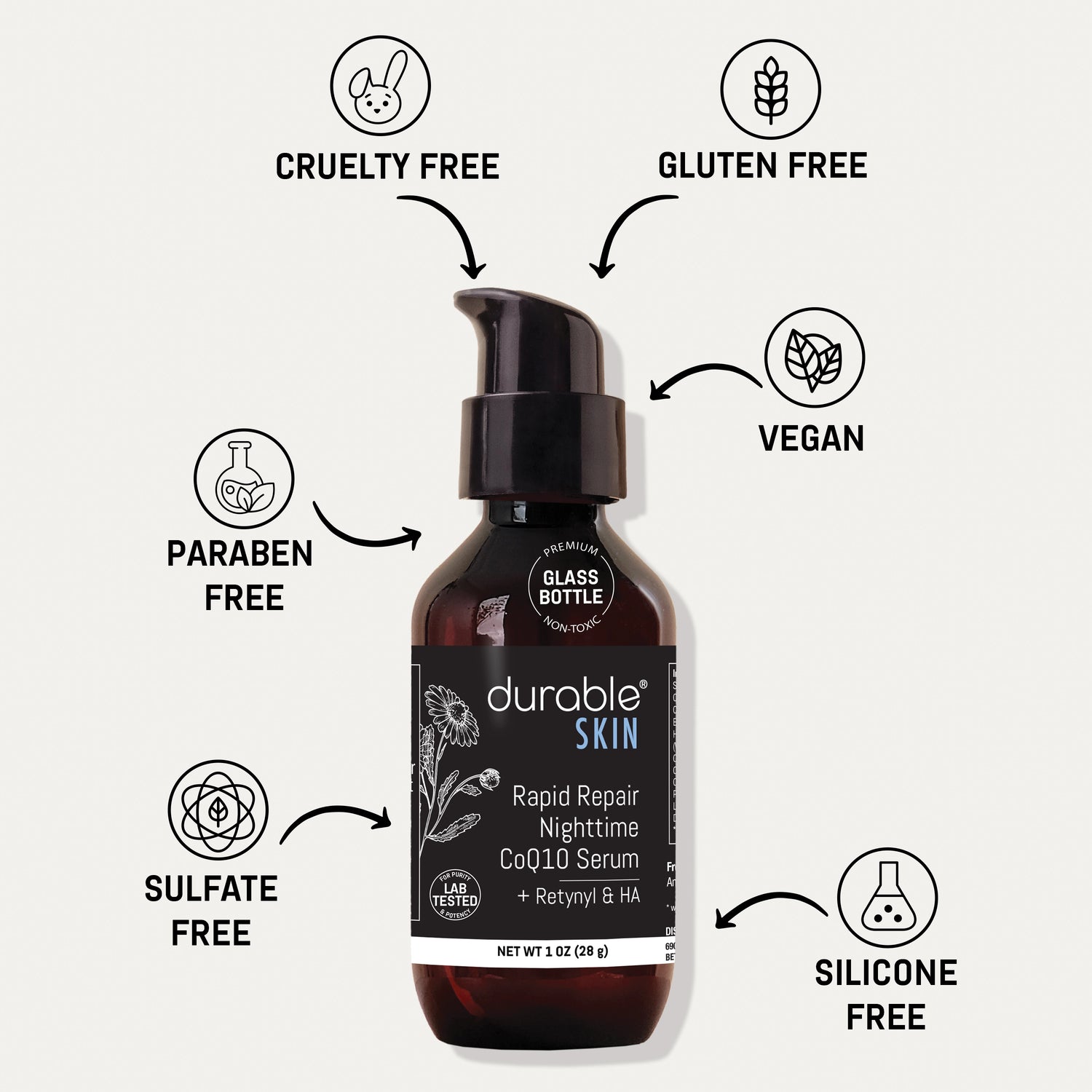 Enter Durable SKIN Rapid Repair Nighttime CoQ10 Serum. This deluxe, science-backed, eco-friendly wrinkle repair serum features the proven and potent super-antioxidant CoQ10 to help revitalize aging skin and protect skin cells against free radical damage.*
