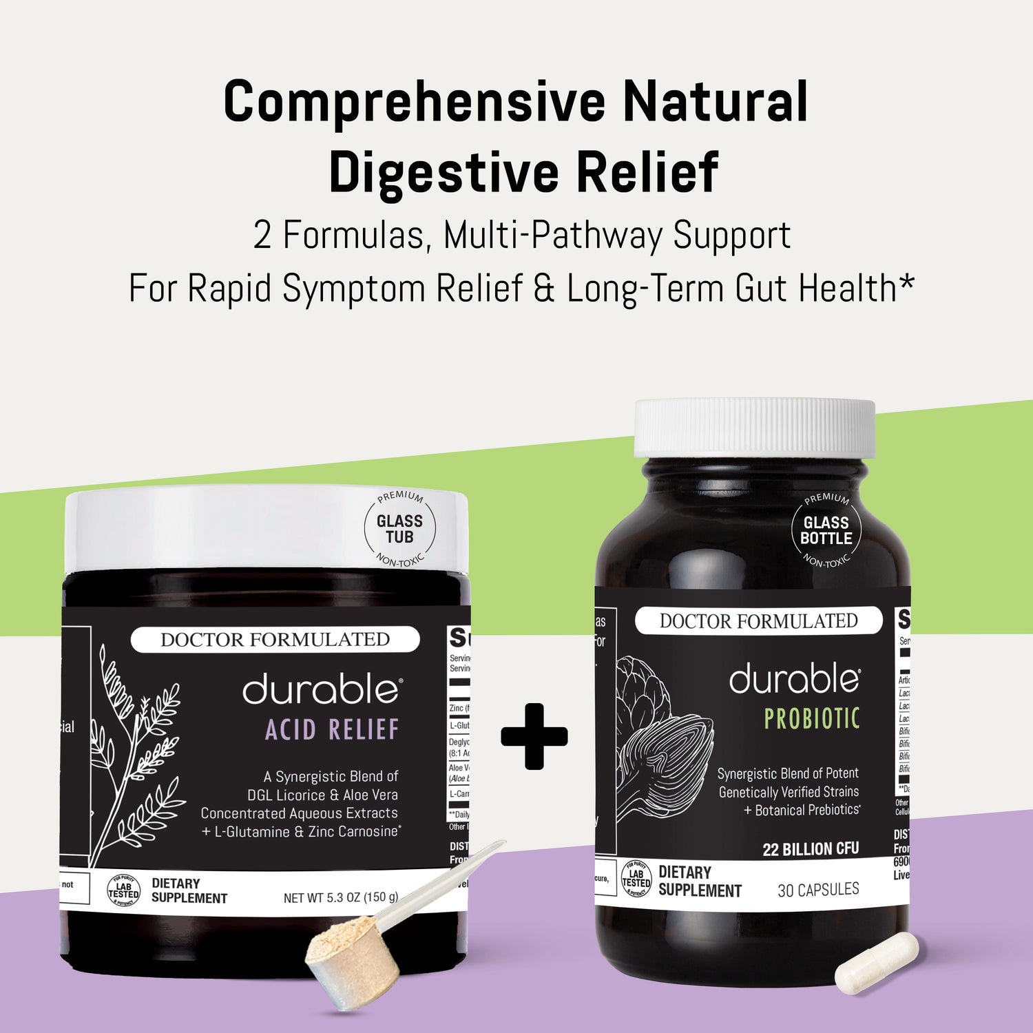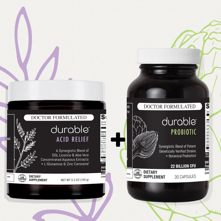Each pack includes 1 tub of Durable ACID RELIEF and 1 bottle of Durable PROBIOTIC (30 day supply). Save up to $31 per 1-month supply.