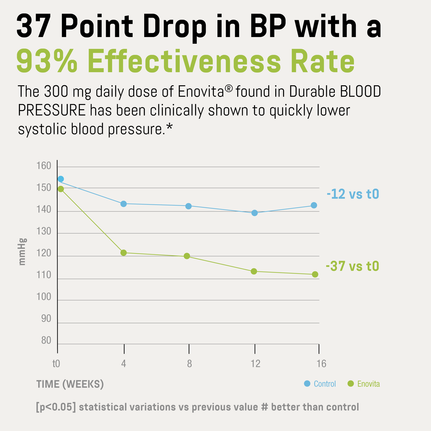 Durable BLOOD PRESSURE contains two clinically validated polyphenol-rich ingredients shown to reduce systolic blood pressure by up to 37 points and diastolic pressure by 9 points within 16 weeks—results comparable to conventional approaches, but without the side effects.*