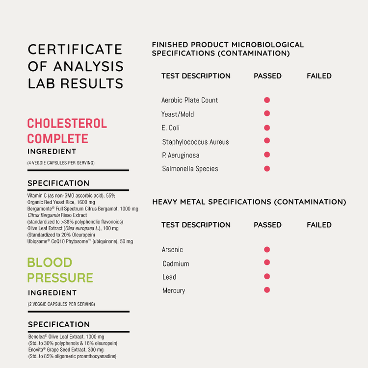 Durable CHOLESTEROL COMPLETE features a powerful blend of five clinically validated ingredients, including extra-strength doses of patented Bergamonte® citrus bergamot and certified organic red yeast rice shown to lower total cholesterol by 29%, lower LDL by up to 36%, raise HDL by 40% and reduce triglycerides by 39% in just 30 days. It also includes ultra-absorbable Ubiqsome® CoQ10 to energize your heart, standardized olive leaf extract to enhance lipid metabolism, and non-GMO vitamin C to boost antioxidant activity and bergamot efficacy.*