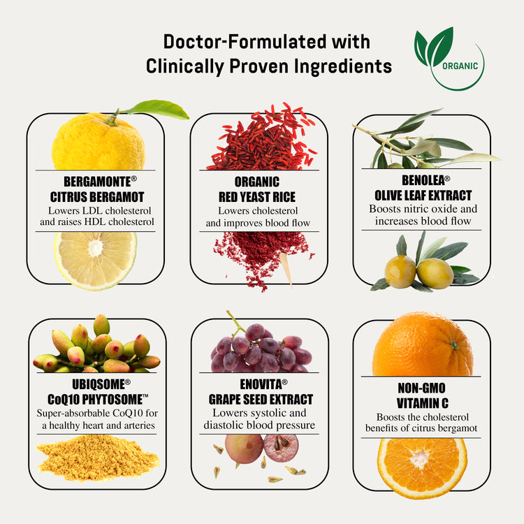 - Bergamonte® Citrus Bergamot (1,000 mg)—This patented extract, sourced from the citrus bergamot fruit grown in Southern Italy, is the most researched form of bergamot available. In clinical trials, a 1,000 mg dose reduced total cholesterol by 29% and LDL by 36%, increased HDL by 40% and lowered triglycerides by 39%—all within 30 days. It also improved blood sugar and C-reactive protein (CRP), a key inflammation marker. Bergamonte® is standardized for five bioactive polyphenols and is the only bergamot extract validated in 14 published human trials.*