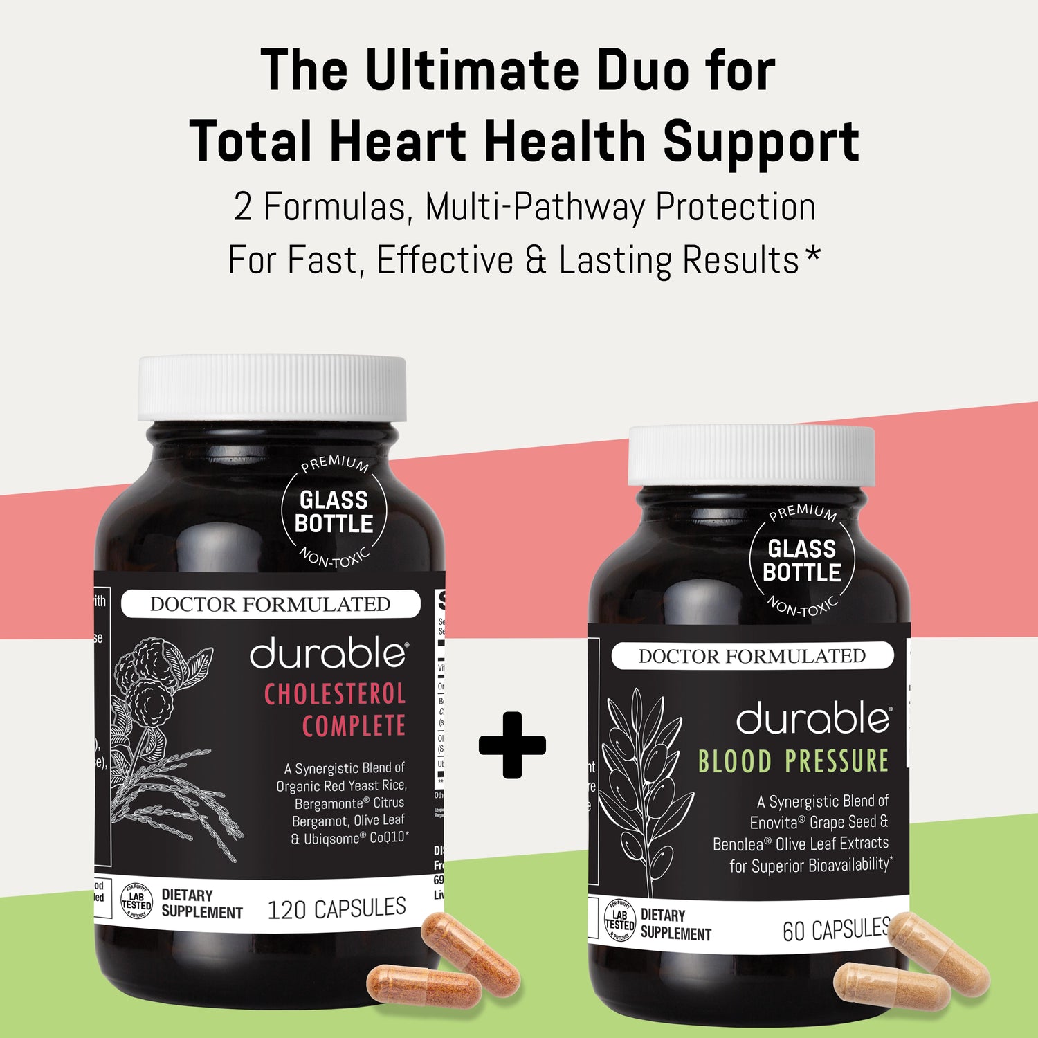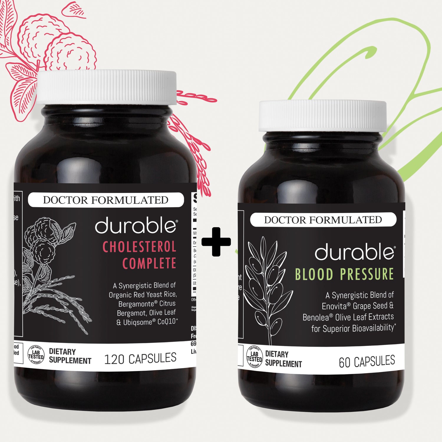 Each pack includes 1 bottle of Durable CHOLESTEROL COMPLETE and 1 bottle of Durable BLOOD PRESSURE (30-day supply). Save up to $35 per 1-month supply.