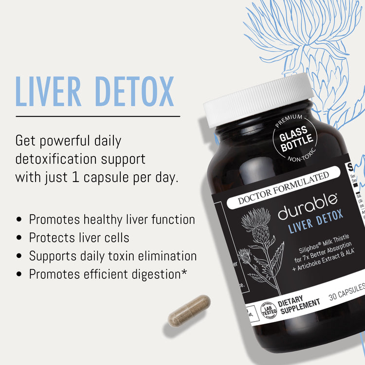 Patients ask me all the time about the best ways to detox. And I always tell them that the most important thing you can do is live a healthy lifestyle that minimizes toxin exposure and support your body’s natural ability to detoxify. I created Durable LIVER DETOX to offer a highly effective daily detox solution, so you can feel your best every day and minimize cellular damage from the ubiquitous toxins in our environment.