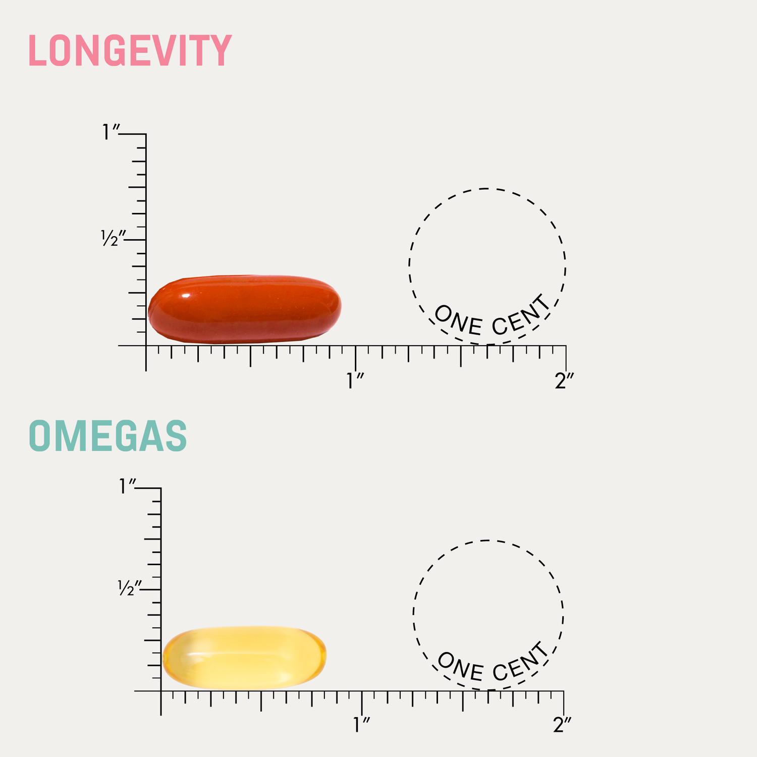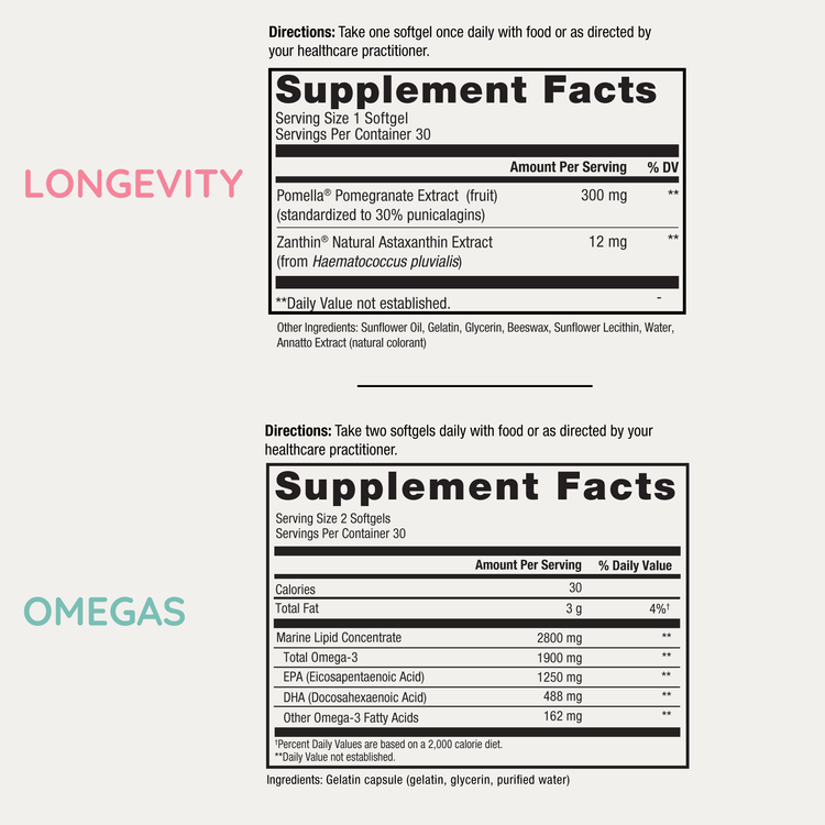 For adults only. Take 1 softgel of Durable LONGEVITY and 2 softgels of Durable OMEGAS daily, with food, or as directed by your healthcare practitioner. You may take both products together or at separate times of the day, depending on preference.
