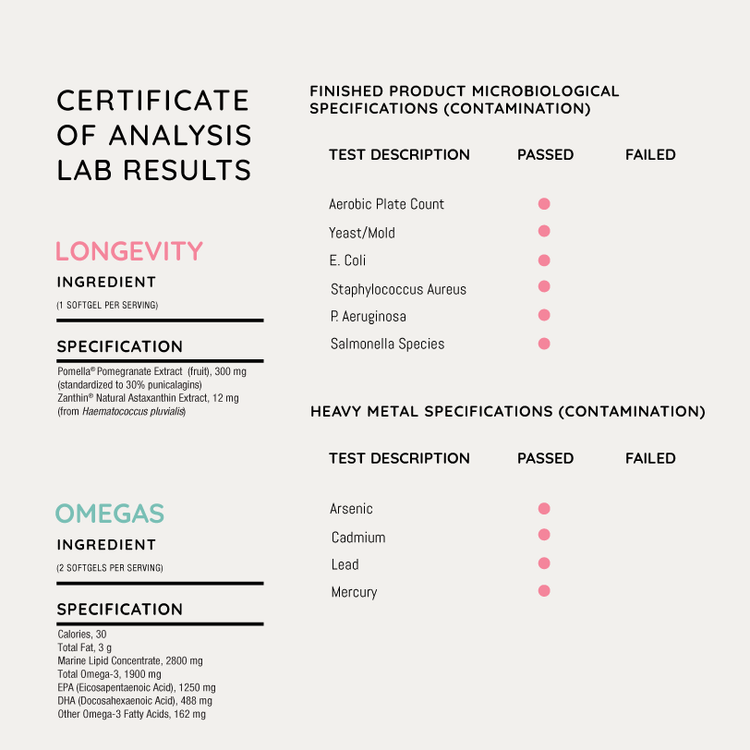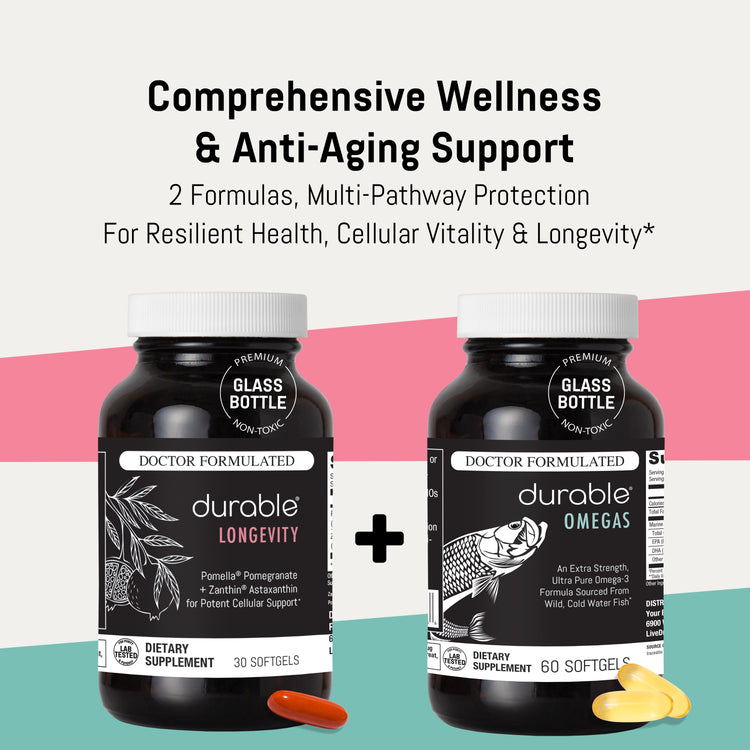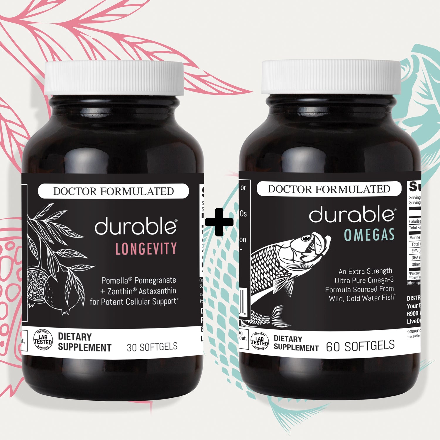 By combining Durable LONGEVITY and Durable OMEGAS, this bundle supports full-spectrum cellular health, brain and cardiovascular function, healthy skin, joints and immune balance—without the risks or inconsistencies of low-potency or impure supplements.*