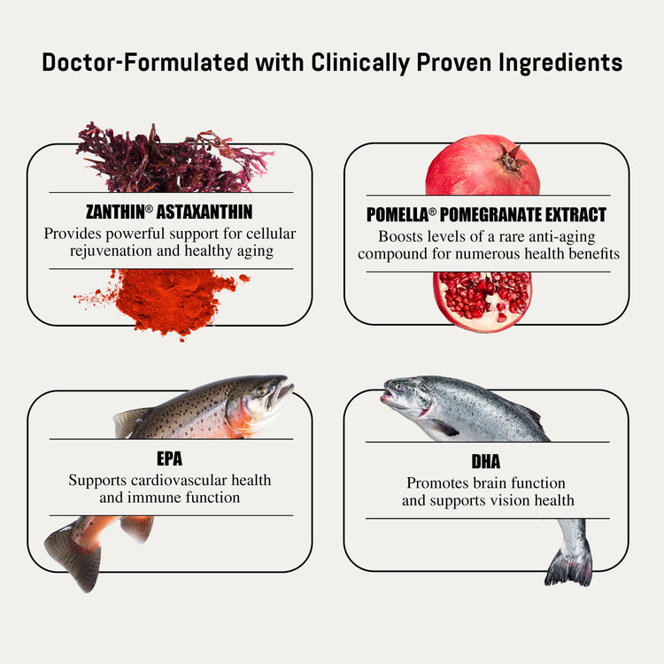 In addition to boosting mitochondrial health, Pomella® increases total antioxidant activity by up to 379% and enhances key enzymes like superoxide dismutase and glutathione peroxidase. It also supports collagen preservation, skin health, and healthy gut barrier function. Together with astaxanthin, Pomella® completes a potent dual-action approach to slowing aging and improving total-body health from the inside out.*