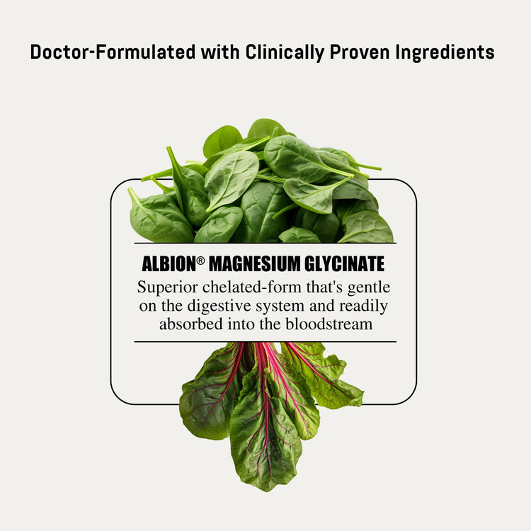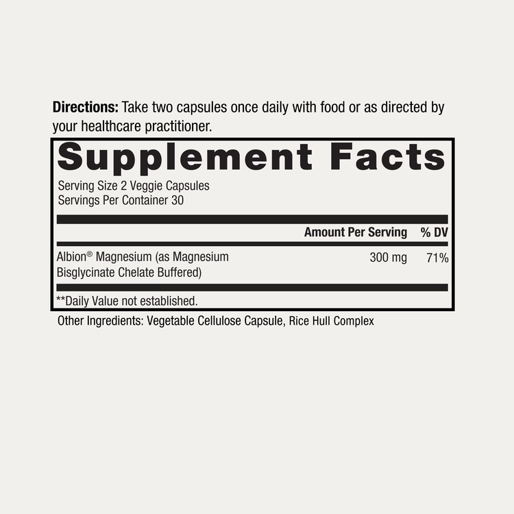 Albion® magnesium glycinate is widely regarded as the world’s most advanced, most bioavailable magnesium ingredient and one of the few forms of magnesium manufactured here in the U.S. It is chelated, meaning that the mineral is molecularly bound to the amino acid glycine, which makes it significantly more absorbable—and more effective.*
