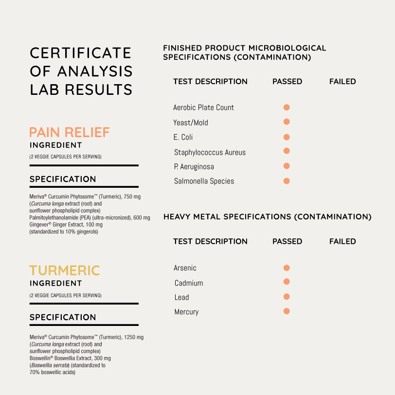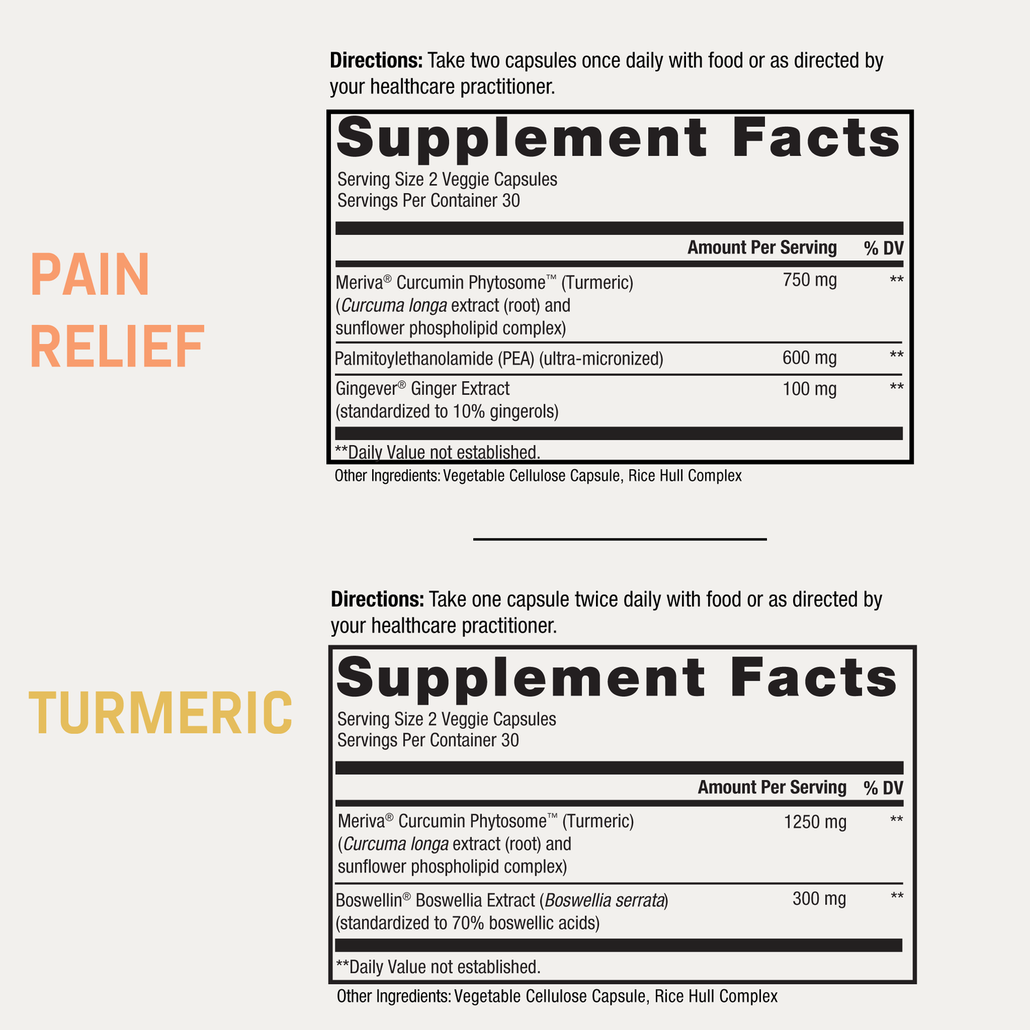 While Durable TURMERIC provides broad-spectrum anti-inflammatory support with a 1,250 mg daily dose of super-absorbable Meriva® Curcumin Phytosome™ and 300 mg of Boswellin® boswellia, Durable PAIN RELIEF provides more targeted pain-soothing support. It helps down-regulate pain signals with a 600 mg dose of ultra-micronized PEA combined with 750 mg of Meriva® and 100 mg of Gingever® ginger. Together, they provide the ultimate natural pain relief solution.*