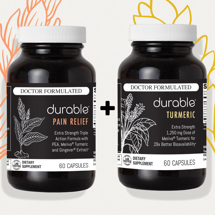 While Durable TURMERIC provides broad-spectrum anti-inflammatory support with a 1,250 mg daily dose of super-absorbable Meriva® Curcumin Phytosome™ and 300 mg of Boswellin® boswellia, Durable PAIN RELIEF provides more targeted pain-soothing support. It helps down-regulate pain signals with a 600 mg dose of ultra-micronized PEA combined with 750 mg of Meriva® and 100 mg of Gingever® ginger. Together, they provide the ultimate natural pain relief solution.*
