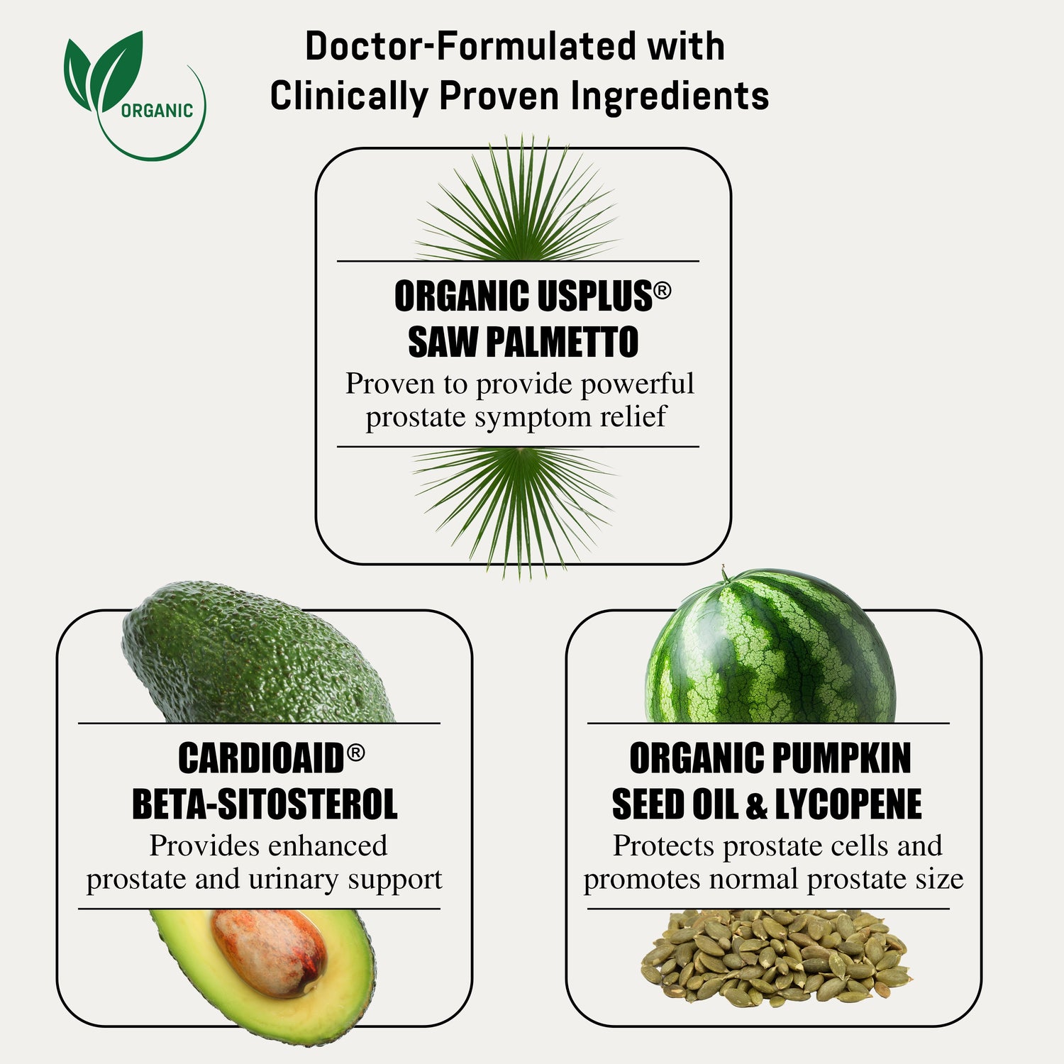 It starts with a clinically proven 320 mg dose of patented, certified organic USPlus® saw palmetto extract, which is standardized to provide 85% fatty acids in the precise ratio shown in over 40 years of clinical research to dramatically improve prostate symptoms with an 88% rate of efficacy. Most supplements are standardized to much lower, unproven fatty acid concentrations and made with saw palmetto grown overseas with heavy pesticide application.*